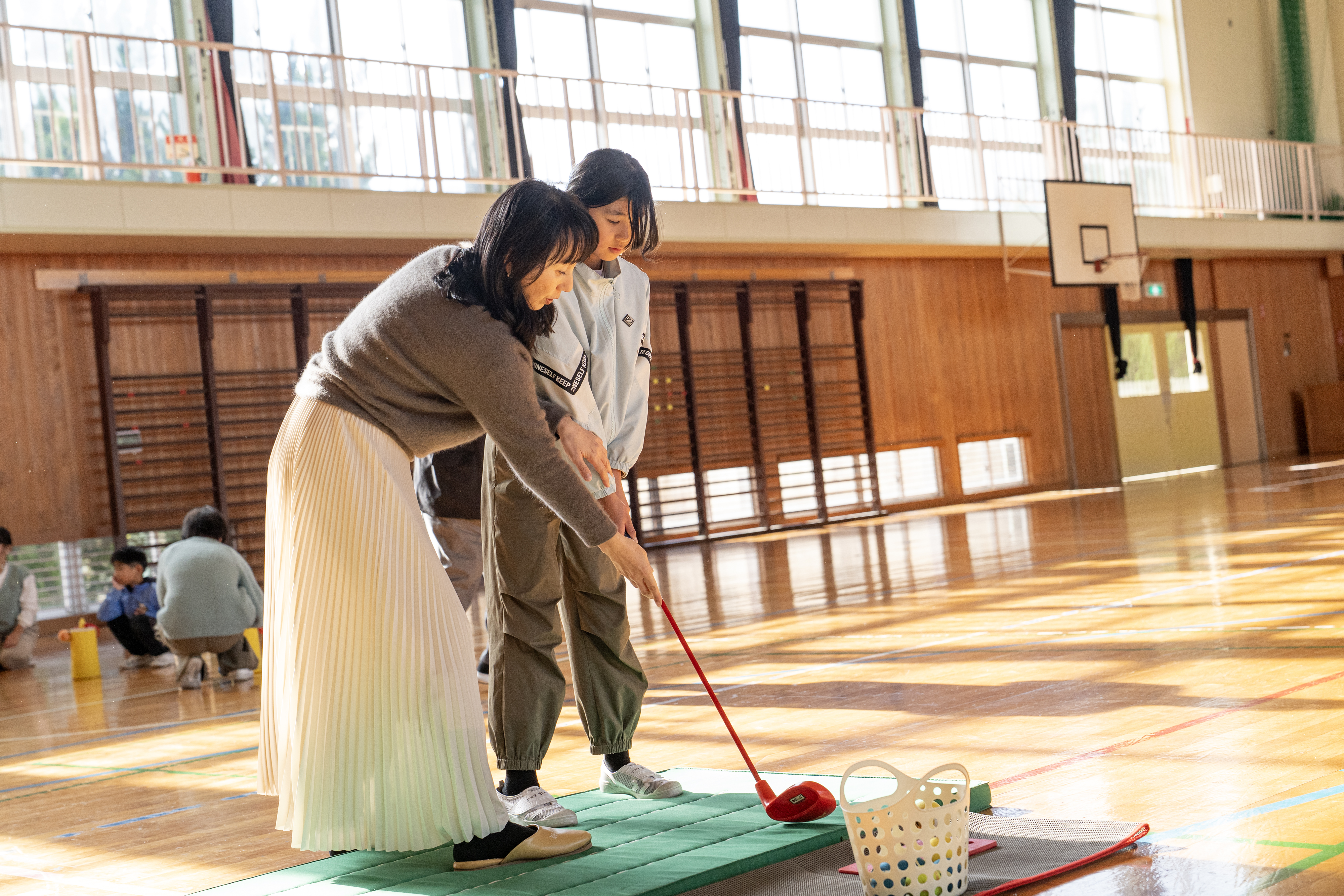 また、学校生活の一コマにも触れられるよう、急きょスナッグゴルフの体験指導や、給食時間の交流も行いました。