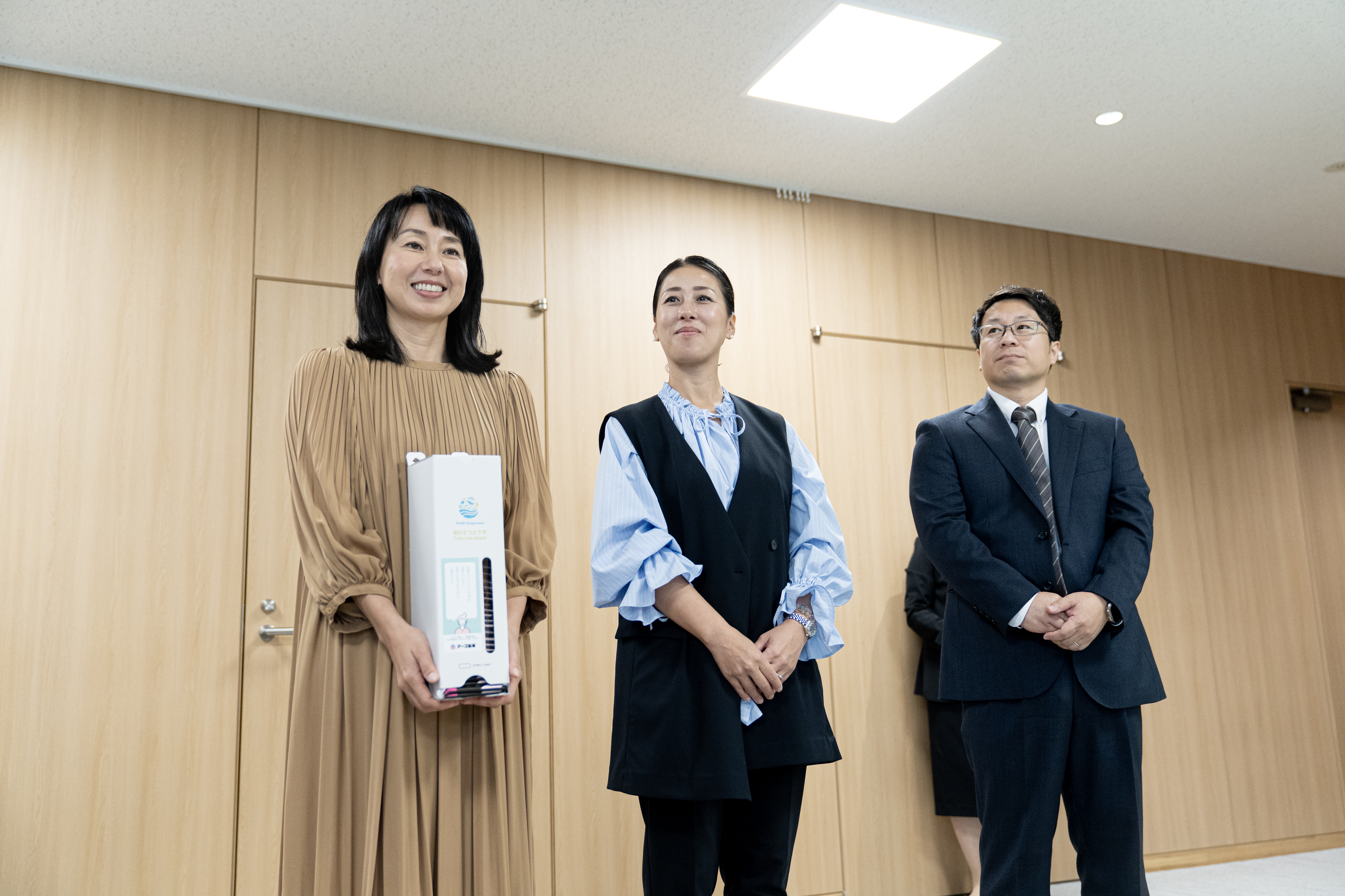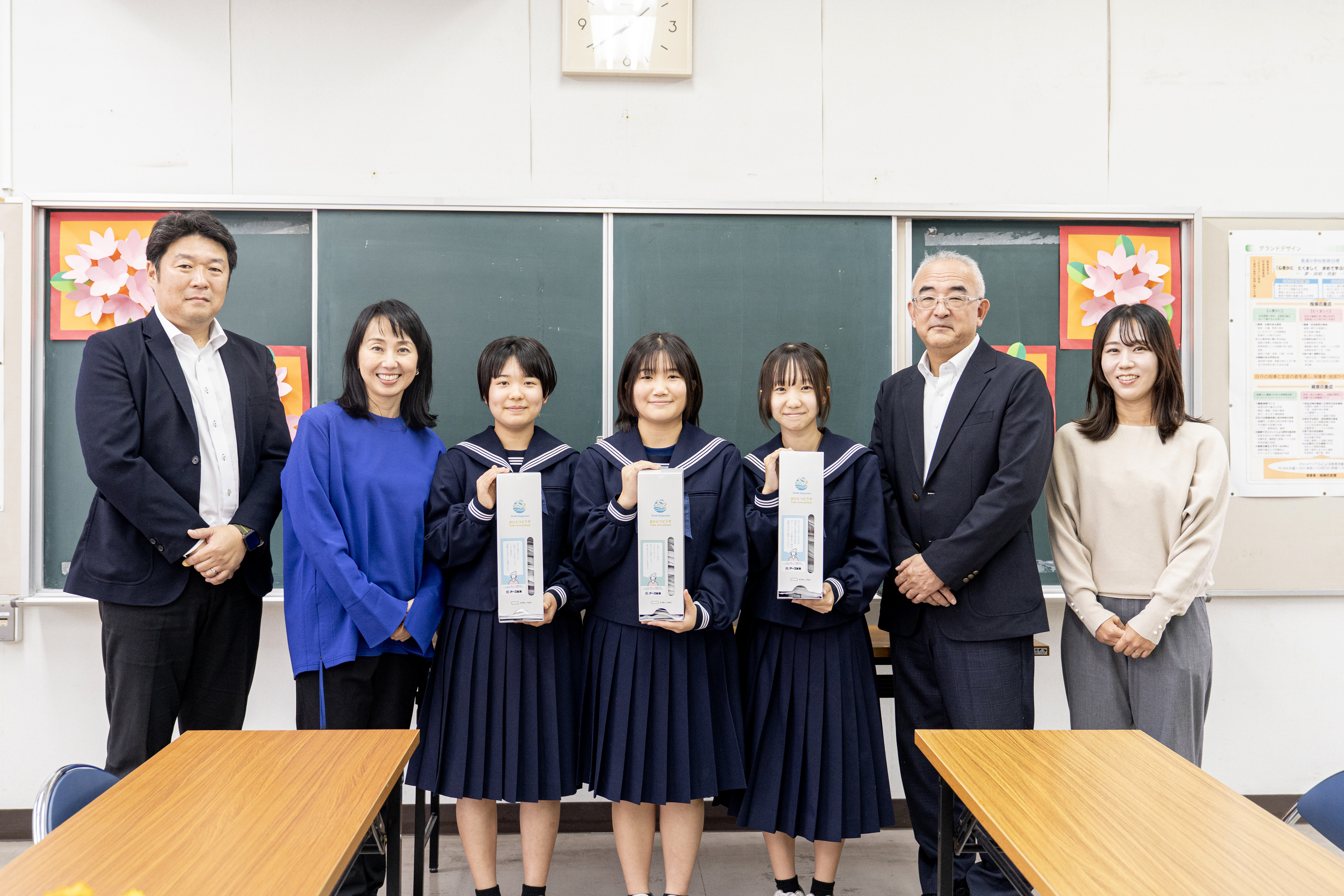 このたび、令和7年6月26日(木)から29日(日)に開催された「アース・モンダミンカップ」ゴルフトーナメントにおいて、バーディー数に応じて寄せられたご寄付により、2025年10月21日(火)に「生理用ナプキン1年分とナプキン収納ボックス」を袖ヶ浦市内の小中学校12校に寄贈させていただきました。うち中学校5校には直接訪問し、贈呈させていただきました。